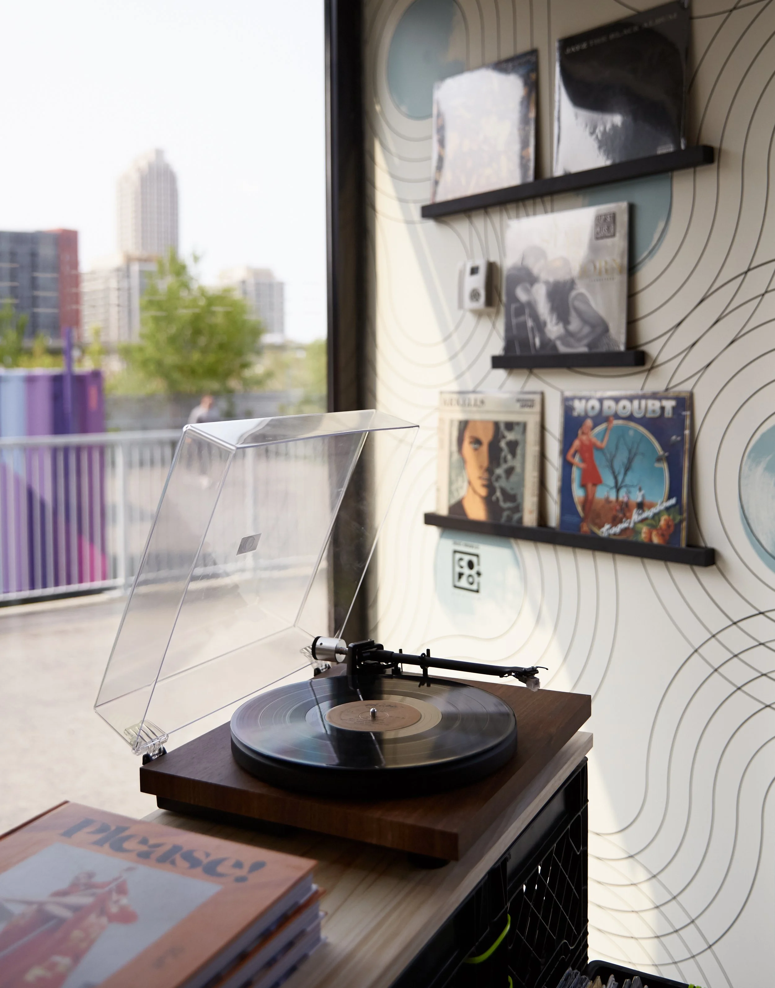 Created a record corner inspired by the "maker" and DIY communities, repurposing milk crates as fixtures to reinforce themes of renewal and sustainability. The adjacent wall featured a custom mural blending vinyl decals and hand-painted elements to evoke motion and texture. Designed to feel like an elevated first apartment, this space invited customers to listen to music and draw design inspiration from its unique fixtures and artistic elements.